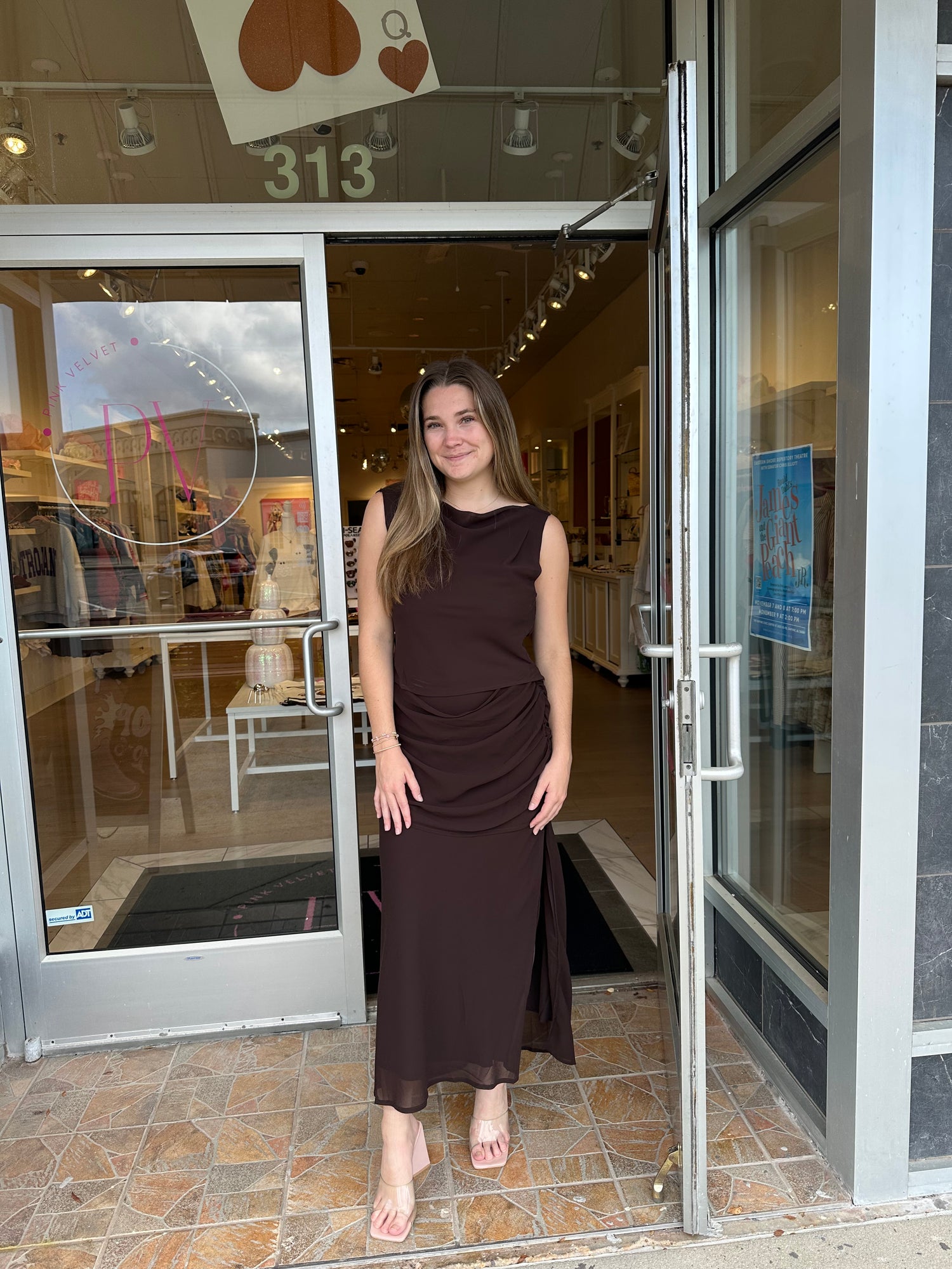 Sleeveless Cowl neck draped chiffon top with midi skirt