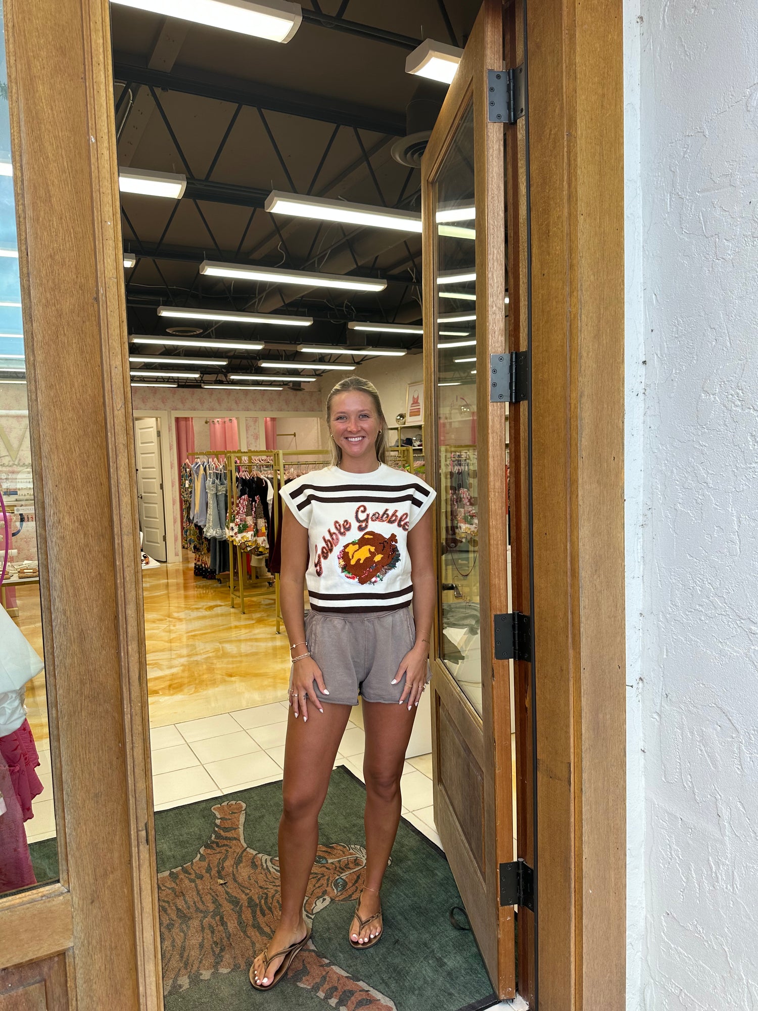 Queen Of Sparkles White & Brown Stripe 'Gobble' Short Sleeve sweater Top