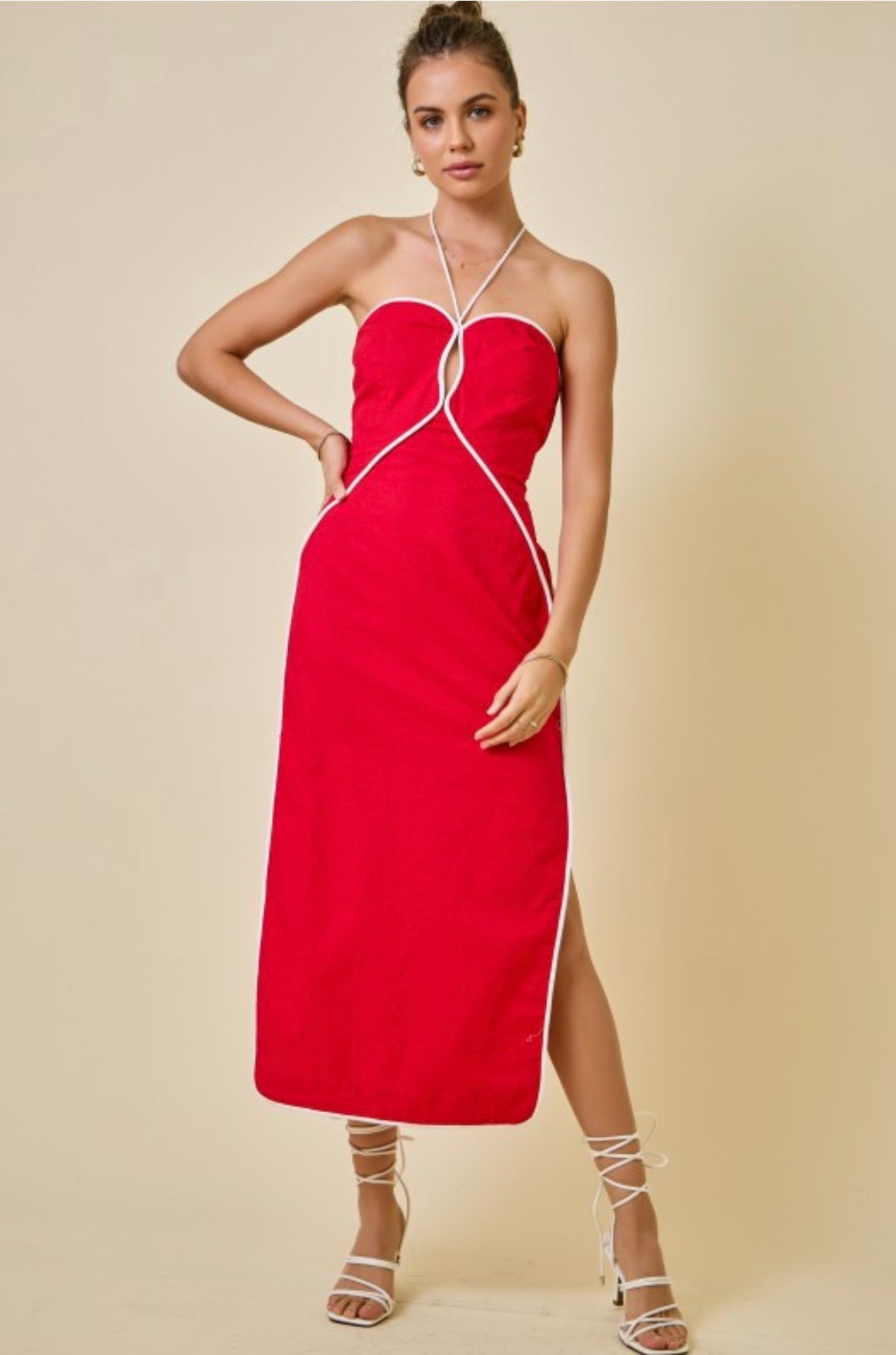 Halter neck cutout midi dress with contrast piping